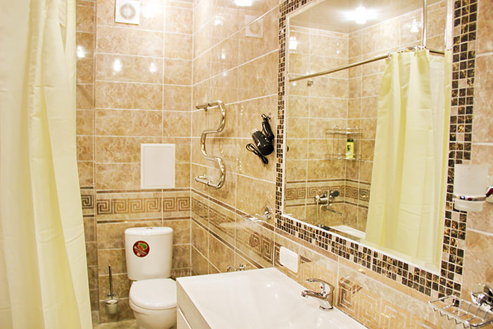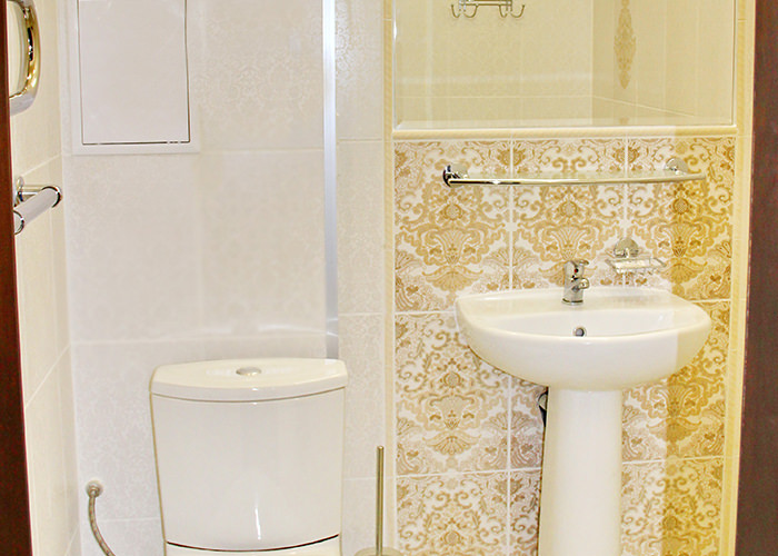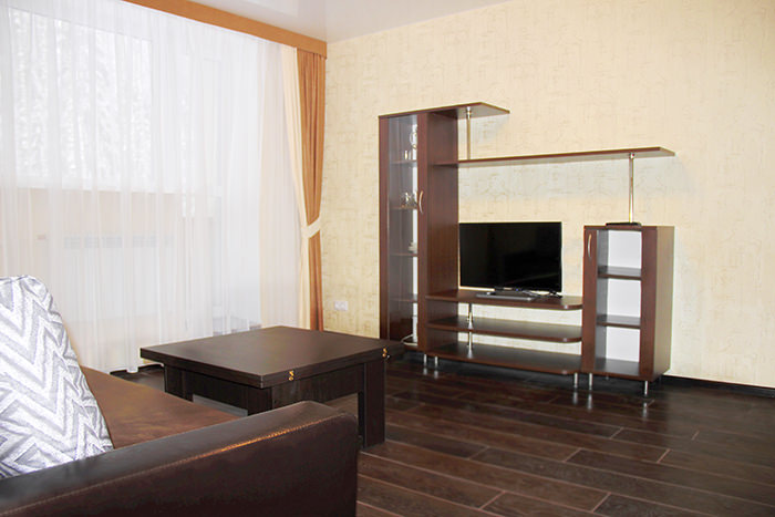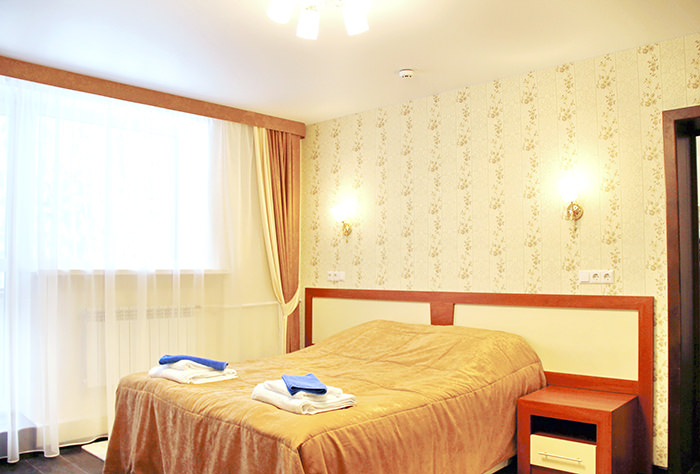 Площадь номера - 50 кв.м. 2 осн. места. 1 доп. место. Балкон. Мебель: вешалка, диван, зеркало, кровать двуспальная, прикроватные тумбочки, столик журнальный, стулья, шкаф. Оборудование: гладильная доска, набор посуды, телевизор, утюг, холодильник, чайный набор посуды, электрочайник. Санузел: с ванной или душевой кабиной, фен. Сервис: Wi-Fi бесплатно, смена полотенец, смена постельного белья, уборка номера.