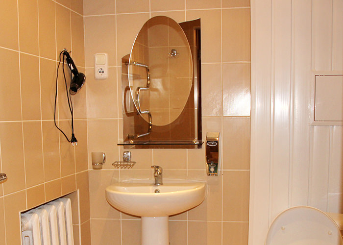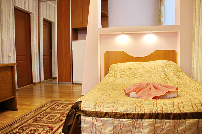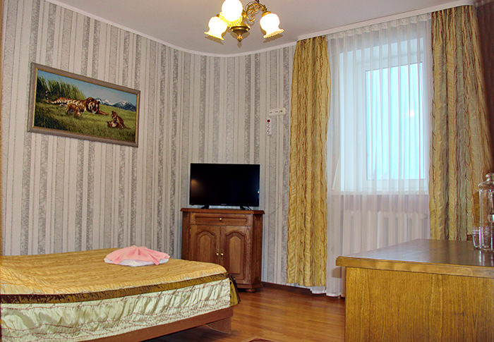 Площадь номера - 28 кв.м. 1 осн. место. 1 доп. место. Балкон. Мебель: вешалка, зеркало, кровать односпальная, прикроватные тумбочки, столик туалетный, стулья, шкаф. Оборудование: гладильная доска, телевизор, утюг, холодильник, чайный набор посуды, электрочайник. Санузел: с ванной или душевой кабиной, фен. Сервис: Wi-Fi бесплатно, смена полотенец, смена постельного белья, уборка номера.