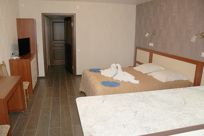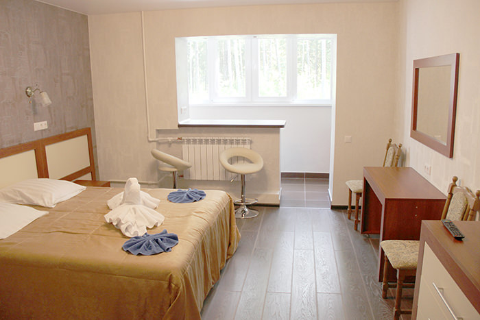 Площадь номера - 25 кв.м. 2 осн. места. 1 доп. место. Мебель: вешалка, зеркало, кровать двуспальная, прикроватные тумбочки, столик туалетный, стулья, шкаф. Мини-кухня. Оборудование: гладильная доска, телевизор, утюг, холодильник, чайный набор посуды, электрочайник. Санузел: с ванной или душевой кабиной, фен. Сервис: Wi-Fi бесплатно, смена полотенец, смена постельного белья, уборка номера.